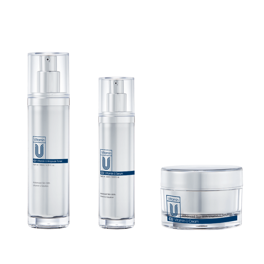 Vitamin U Ampoule Toner - Water, Dipropylene Glycol, Propanediol, Glycerin, Niacinamide, Ethoxydiglycol, Butylene Glycol, Caprylyl Glycol, PEG-60 Hydrogenated Castor Oil, Olive Oil PEG-7 Esters, Hydroxyethyl Acrylate/Sodium Acryloyldimethyl Taurate Copolymer, 1,2-Hexanediol, Ethylhexylglycerin, Sodium Hyaluronate, Adenosine, Beta-Glucan, Hydroxyethylcellulose, Polysorbate 60, Sorbitan Isostearate, Fragrance, Hydrogenated Polyisobutene, Methylmethionine, Dipeptide Diaminobutyroyl Benzylamide Diacetate, Disodium Phosphate, Palmitoyl Tripeptide-5, Gentiana Lutea Root Extract, Arnica Montana Flower Extract, Sodium Phosphate, Achillea Millefolium Extract, Artemisia Vulgaris Extract, Acetyl Hexapeptide-8, Anemarrhena Asphodeloides Root Extract, Tocopherol Vitamin U Serum - Water, Glycerin, Butylene Glycol, 1,2-Hexanediol, Niacinamide, Arginine, Carbomer, Hydrogenated Phosphatidylcholine, Dipotassium Glycyrrhizate, Allantoin, Ethylhexylglycerin, Polyglutamic Acid, Adenosine, Sodium Hyaluronate, Dehydroxanthan Gum, Belamcanda Chinensis Root Extract, Hydrolyzed Soy Protein, Hydrolyzed Corn Protein, Hydrolyzed Wheat Protein, Methylmethionine, Dipeptide Diaminobutyroyl Benzylamide Diacetate, Hydroxyethylcellulose, Histidine, Hydrogenated Lecithin, Serine, Methionine, Fragrance, Polyglyceryl-10 Laurate, Ceramide NP, Polysorbate 20, Lecithin, Palmitoyl Pentapeptide-4, Oligopeptide-1, Alanine/Histidine/Lysine Polypeptide Copper HCl, sh-Oligopeptide-1, Vitamin U Cream - Water, Butylene Glycol, Cyclopentasiloxane, Dipropylene Glycol, Sorbitan Olivate, Caprylic/Capric Triglyceride, Butyrospermum Parkii (Shea) Butter, Niacinamide, Hydrogenated Polyisobutene, Hydrogenated Polydecene, Cetyl Alcohol, Cetearyl Olivate, Butylene Glycol Dicaprylate/Dicaprate , Polysorbate 60, Stearic Acid, Glycerin, Cyclohexasiloxane, Dimethicone/Vinyl Dimethicone Crosspolymer, Simmondsia Chinensis (Jojoba) Seed Oil, Sorbitan Stearate, Sodium Acrylates Copolymer, Glyceryl Stearate, Scutellaria Baicalensis Root Extract, Beeswax, Paeonia Suffruticosa Root Extract, PEG-100 Stearate, 1,2-Hexanediol, Lecithin, Polyacrylamide, Hydrogenated Phosphatidylcholine, Tocopheryl Acetate, Olea Europaea (Olive) Fruit Oil, Allantoin, Macadamia Ternifolia Seed Oil, C13-14 Isoalkane, Ethylhexylglycerin, Polyglutamic Acid, Adenosine, Fragrance, Laureth-7, Hyssopus Officinalis Extract, Sodium Hyaluronate, Brassica Oleracea Italica (Broccoli) Extract, Dehydroxanthan Gum, Dipotassium Glycyrrhizate, Belamcanda Chinensis Root Extract, Hydroxyethylcellulose, Histidine, Hydrogenated Lecithin, Serine, Methionine, Polyglyceryl-10 Laurate, Anemarrhena Asphodeloides Root Extract, Hydrolyzed Soy Protein, Hydrolyzed Corn Protein, Hydrolyzed Wheat Protein, Ceramide NP, Dipeptide Diaminobutyroyl Benzylamide Diacetate, Polysorbate 20, Methylmethionine, Tocopherol, Palmitoyl Pentapeptide-4, Alanine/Histidine/Lysine Polypeptide Copper HCl, sh-Oligopeptide-1