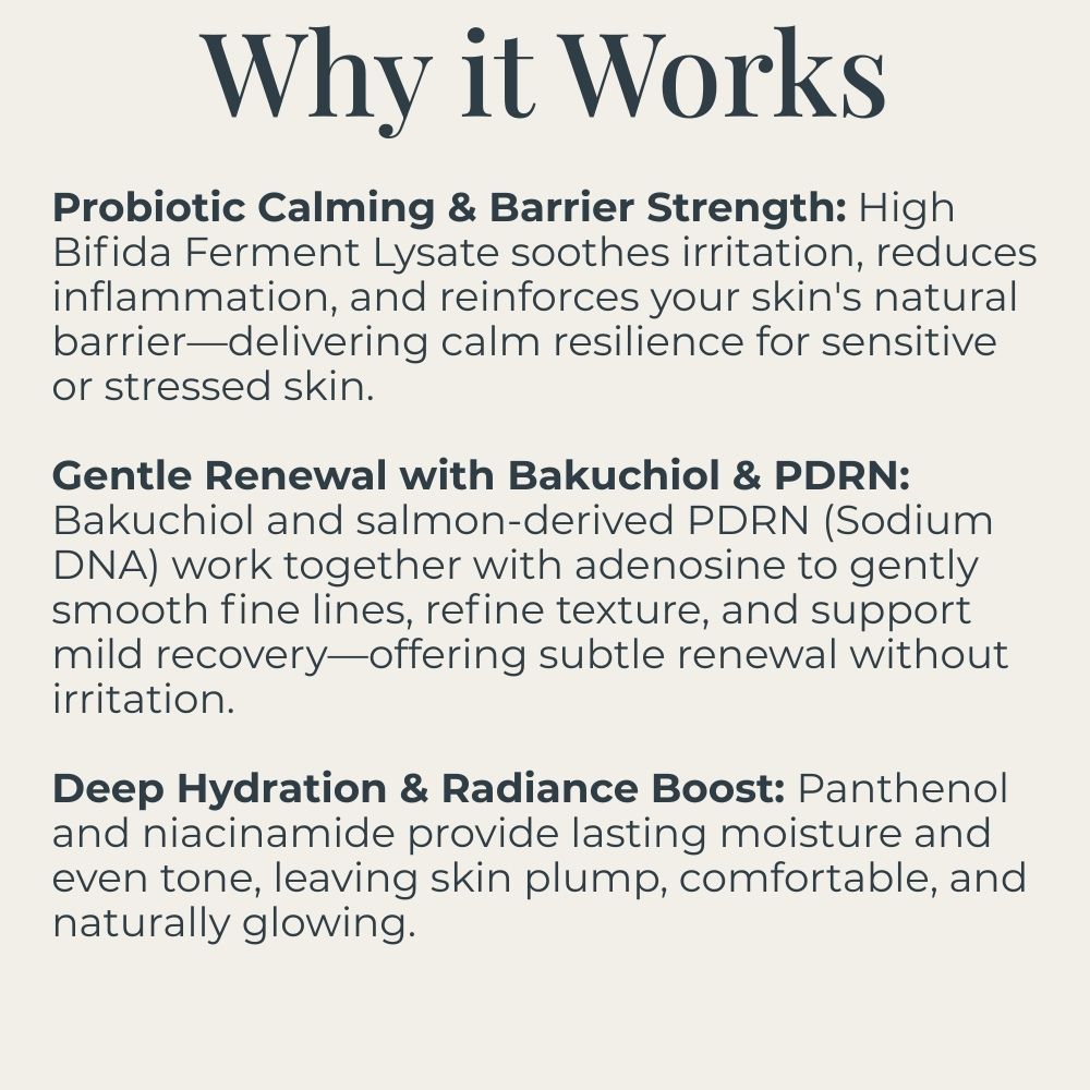 This lightweight, probiotic-powered ampoule combines high Bifida ferment lysate with gentle bakuchiol to soothe, hydrate, and softly renew skin—delivering calm comfort, improved texture, and subtle anti-aging support without irritation or stickiness.