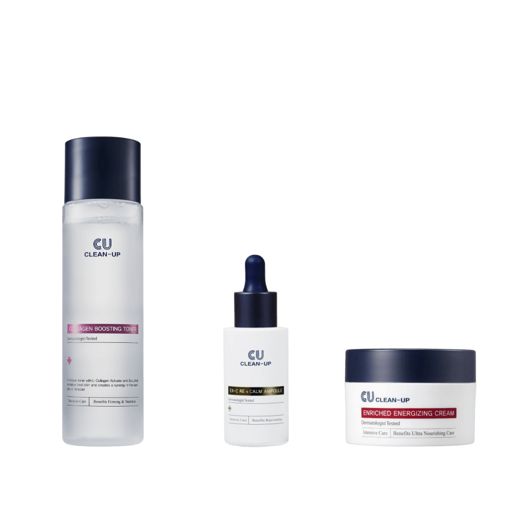 Collagen Boosting Toner - Water, Dipropylene Glycol, Butylene Glycol, 1,2-Hexanediol, Propanediol, Polyglyceryl-10 Laurate, Ethylhexylglycerin, Adenosine, Sodium Hyaluronate, Hydrogenated Polyisobutene, Glycerin, Tromethamine, Soluble Collagen(10ppm), Hydrolyzed Collagen(10ppm), Mannan, Pentylene Glycol, Mannose, Hydrolyzed Elastin, Copper Tripeptide-1, Bakuchiol, Glucose, Alanine/Histidine/Lysine Polypeptide Copper HCl, Acetyl Hexapeptide-8, Anemarrhena Asphodeloides Root Extract, Tocopherol, Acrylates/C10-30 Alkyl Acrylate Crosspolymer, Citric Acid EX-C RE N Calm Ampoule - Water, Glycerin, Propanediol, 1,2-Hexanediol, Sodium DNA, Sodium Hyaluronate, Ethylhexylglycerin, Adenosine, Hydroxyethylcellulose, Ectoin, Pentylene Glycol, Madecassoside, Methyl Methionine Sulfonium Chloride, SH-Oligopeptide-1, Lecithin, Butylene Glycol, Polysorbate 20, Disodium Phosphate, Polysorbate 60, Sodium Phosphate Enriched Energizing Cream - Water, Glycerin, Caprylic/Capric Triglyceride, Butylene Glycol, Butyrospermum Parkii (Shea) Butter, Beeswax, Dipropylene Glycol, Triethyl Citrate, Cetyl Alcohol, Niacinamide, Polysorbate 60, Stearic Acid, Vinyl Dimethicone, Ceramide NP, Glyceryl Stearate, Propanediol, 1,2-Hexanediol, PEG-100 Stearate, Sodium Acrylate/Sodium Acryloyldimethyl Taurate Copolymer, Hydrogenated Lecithin, Coptis aponica Extract, Polyisobutene, Caprylyl Glycol, Xanthan Gum, Ethylhexylglycerin, Panthenol, Fragrance, Adenosine, Ceramide NS, Ceramide AS, Ceramide AP, Cholesterol, Caprylyl/Capryl Glucoside, Sorbitan Oleate, Camellia Sinensis Leaf Extract, Hydrolyzed Collagen, Centella Asiatica Extract, Copper Tripeptide-1, Acetyl Hexapeptide-8, Alanine/Histidine/Lysine Polypeptide Copper HCl, Ceramide EOP